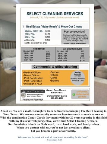 Whether it’s a high-traffic medical clinic, a brand-new commercial development or the home you lay your head at night, we bring 25+ years of West Texas grit and a "Select" eye for detail to every job.